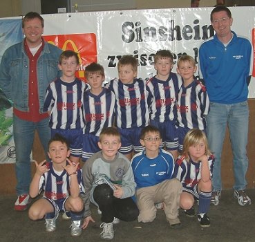 4. Platz beim Mc Donalds Hallencup (Foto: Wörner)(bro) (jk) In der Vorrunde traf die E1 auf den TSV Steinsfurt, den FSV Waiblingen und den VFR Walldorf. Dem TSV Steinsfurt, dem späteren Turniersieger, brachte man mit 3:2 die einzige Niederlage bei. Gegen den TSV Waiblingen verlor der VfB klar mit 5:2. Mit einem 6:3 Sieg gegen den VFR Walldorf zog die E-Jugend ins Viertelfinale ein. Hier lautete der Gegner SV Sinsheim. Diesen schoss man mit 5:1 aus dem Turnier. Im Halbfinale wartete der SV Babstadt. Trotz vieler klarer Torchancen verlor die E1 mit 3:2. Das kleine Finale bestritt der VfB wieder gegen den TSV Waiblingen. Hier steckte das unglückliche Halbfinale noch in den Köpfen der Spieler, und so verlor man mit 4:1.
