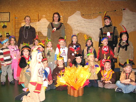 Zu Beginn des Festes erinnerten die Erzieherinnen Rebecca Knapp und Stefanie Schwarzer noch einmal kurz an die Highlights des Projekts. Da war zum einen der Besuch von "Turned Apple" – Thomas Merbt vom Indianermuseum Bretten. Das adoptierte Stammesmitglied der Santa-Rosa-Creek-Indianer aus Florida brachte Gebrauchsgegenstände, Schmuck und Spielzeug mit, wie sie die Indianer seit Jahrhunderten aus den Naturmaterialien ihrer Lebensräume hergestellt haben. Und die Kinder durften alles anfassen, begutachten und ausprobieren. Ein weiterer Höhepunkt war die Indianerprüfung. Für ihre Fertigkeiten im Kriechen, Klettern, Kanu fahren und Speer werfen gab es eine Indianerurkunde. Letzter Höhepunkt und gleichzeitig Abschluss war das Familienfest. Das Lied vom "kleinen Indiomann" erklang. Spielerisch wurde ein Tag im Leben der Hakanunu-Indianer beschrieben, ein englisches Indianerlied gesungen und um das Lagerfeuer getanzt.