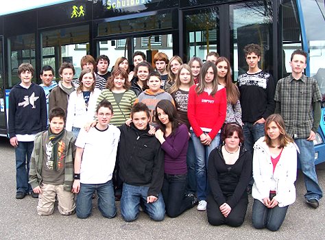 Markus Böhm, Leiter der Stadtwerke, kam persönlich mit einem Stadtbus und bot die Möglichkeit, das Gelernte in der Praxis umzusetzen. Was passiert bei einer Vollbremsung, wenn ein Rucksack nicht gut verstaut ist? Wenn Schüler/Innen auf den Lehnen sitzen? Wenn ungesicherte Flaschen durch die Gegend fliegen? Auch konnten die Schüler erkennen, dass es dem Busfahrer von seinem Sitz aus manchmal unmöglich ist, Gefahren im Bus rechtzeitig zu erkennen.