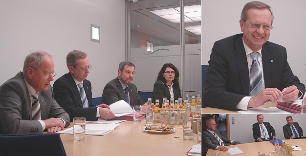 Gutes Geschäftsjahr 2007 – Stehen zu den eigenen Wurzeln Bericht zum Geschäftsjahr 2007: Vorstandsvorsitzender Herbert Hinterschitt, Stellvertreter Ekkehard Saueressig, Vorstandsmitglied Friedrich Heuser und Marketingassistentin Sabine Heckel (links, v.l.). Ekkehard Saueressig bei seinen Ausführungen zur Finanzkrise am Geldmarkt, welche die Volksbank von deren Anleihenstruktur her nur peripher tangiere (oben). Der Vorstand im Gespräch mit der Presse. (Fotos:Gündling)(ag) Zufrieden zeigte sich der Vorstand der Volksbank Neckartal eG beim gestrigen Bericht an die Presse zur Jahresbilanz 2007. – Mit 6 % Dividendenausschüttung, einer Erhöhung um geplante 2,5 % auf 962 Millionen Euro Bilanzsumme und Zuwächsen im Aktiv- und Passivgeschäft konnte demgegenüber die Einbuße in der Bankmarge, bedingt durch den scharfen Wind in Wirtschaft und Wettbewerb, durch Einsparungen im Verwaltungsaufwand gut abgefedert werden.