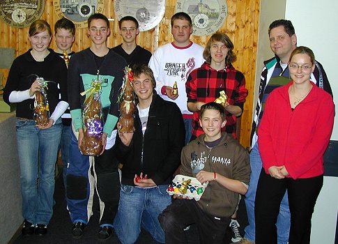 Bei bester Stimmung wurde anschließend die Siegerehrung durchgeführt. Die drei ersten Preise, entsprechend dem Anlass waren es riesige Schokohasen, erhielten Stephan Schölch, Robin Püschel und Nina Johe.