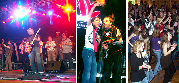 Riesenstimmung in der Stadthalle Band-Leader Mike Frank, auf dem mittleren Bild zusammen mit Sängerein Christin Kieu begeisterte mit "Me and the Heat" (linkes Bild) die Musikfans beim diesjährigen Osterrock des Kulturlabors. 900 Musikfans sorgten für ein ausverkauftes Haus und Riesenstimmung. (Fotos: Baumgartner)(tb) Riesenstimmung herrschte gestern Abend in der Eberbacher Stadthalle. Zum Osterrock war es dem Kulturlabor Eberbach wieder einmal gelungen mit "Me and the Heat" eine der im Augenblick wohl angesagtesten Party-Bands Deutschlands nach Eberbach zu lotsen. Nicht nur die Osterfeiertage, sondern auch die Qualität der Band sorgten mit 900 Musikfans für ein ausverkauftes Haus.