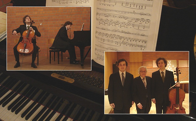 Konzert mit vergnüglicher Cello-Klavier-Musik - Wie erste Blumen im März Julian Arp am Violoncello und Caspar Frantz am Flügel (linkes Bild). Karlheinz Mai von den Eberbacher Kunstfreunden mit den beiden namhaften Musikern nach dem Konzert. (Fotos:Gündling)(ag) Es dauert manchmal, bis die Sonne den Winterschnee fortschmilzt, im Frühling. - Bei den Kunstfreunden Eberbach waren gestern Abend die Musiker Julian Arp und Caspar Frantz im Evangelischen Gemeindehaus zu Gast. Mit ihrem Violoncello und Klavier brachten sie wieder die Sonne in die Herzen der Freunde der ernsten Musik. Besonders im zweiten Programmteil mit Werken von Manuel de Falla und Astor Piazolla überzeugten sie das zahlreich erschienene Publikum.