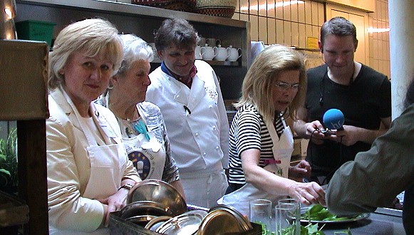 Bei einer Radiosendung hatten sich eifrige Zuhörer in der Vergangenheit um einen Kochkurs in Eberbachs Hotel Krone-Post bewerben können. Innerhalb weniger Minuten sei die Veranstaltung ausgebucht gewesen, berichtete Moderatorin Angelika Bork, die heute mit den hessischen Teilnehmerinnen und Teilnehmern ins Neckartal gereist war. Man wollte Küchen-Kniffe bei einem guten Koch lernen. Bevor aber die Küche der Krone-Post in Beschlag genommen werden konnte, wurde erst einmal frische Ware auf dem Markt in Michelstadt eingekauft, von wo auch HR4 live sendete. Zurück in Eberbach, stand ein Besuch im Küfereimuseum bei Friedel und Werner Helm auf dem Programm sowie ein Einblick in die Herstellung der Bärlauchtrüffel der Viktoria-Konditorei.