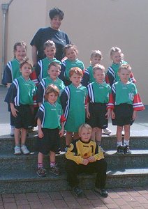 Saisonabschluss der Handball-Minis in Leimen Trainerin Andrea Beszedes, hinten v.l.: Michelle Ruppaner, Nelly Wettig, Johanna Walz, Andrea, Clara, Mitte v.l.: Luca Gromes, Julian Lemberger, Fabian Sohns, Florian Beisel, Mick Hascher, vorne: Ulrike Tewes, Carsten Stillner. (Foto:privat)