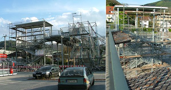 Die neue Treppenanlage (rechtes Bild) soll immerhin ab 3. Mai benutzbar sein, so dass die Passanten nicht länger über das wackelige Provisorium aus Gerüstbauteilen klettern müssen.