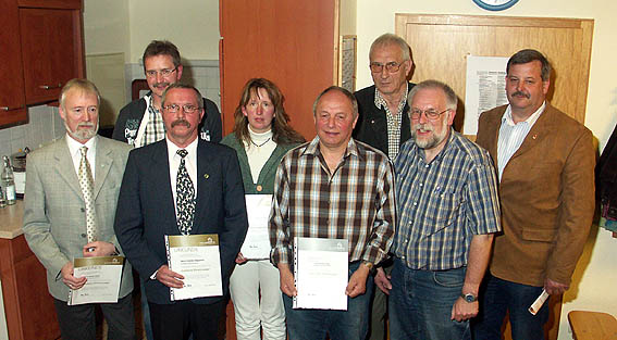 Günther Gepperth und Erich Haaf in ihren Ämtern bestätigt Unser Foto zeigt die geehrten Mitglieder der Siedlergemeinschaft Strümpfelbrunn mit Kreisrat Norbert Bienek (2.v.r), Ortsvorsteher Paul Scholl (links),sowie Gemeinschaftsleiter, Kreisvorsitzender und Mitglied des Landesvorstandes Günter Gepperth (3.v.l). (Foto: Baumgartner)