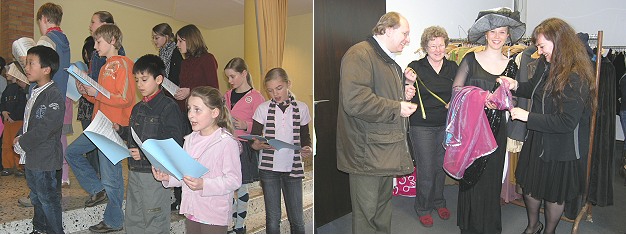 Chorproben, Kostümpracht und ein hochkarätiges Sommerprogramm Mit Feuereifer bei der Sache sind die Sängerinnen und Sänger des neugegründeten Kinderchors für die Zwingenberger Schlossfestspiele. Dass da nach einer langen Probeeinheit schon mal „der Hals ein bisschen weh tut“ wird gerne in Kauf genommen (l.). Todschick zum Ascot-Derby: Damit auch die Kostüme beim weltberühmten Musical „My Fair Lady“, das erstmals in Zwingenberg aufgeführt werden wird, „punkten“, ist Schneidermeisterin Bärbel Hodapp (zweite von links) schon jetzt fleißig am zuschneiden, abstecken und nähen. (Fotos:Nolten-Casado/Schlossfestspiele)(ag) (sch) Hinter den Kulissen der Schlossfestspiele laufen die Vorbereitungen auf Hochtouren: nicht nur der große Chor, sondern auch die Kinder proben bereits unter der Leitung von Professor Klaus Eisenmann, der sich sehr angetan zeigte, vom „frischen, frechen Klang“ der jungen Sängerinnen und Sänger und auch wenn Jana nach einer einstündigen Probe „der Hals ein bisschen weh tat“, so war sie sich doch mit Emma, Jenny und allen anderen einig: „Macht ganz viel Spaß.“ - Dass der Kinderchor künftig zu einem festen Bestandteil der Zwingenberger Schlossfestspiele werden soll, ist erklärter Wille des neuen künstlerischen Leiters, Karsten Huschke, der insbesondere die „Zuschauer von morgen“ mehr einbinden und ansprechen will, weshalb auch das für Samstag, den 9. August, geplante Kinderkonzert „Peter und der Wolf“ durch den Einsatz des gesamten Festspielorchesters entsprechend aufgewertet wird.