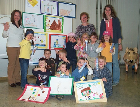 Kiga-Kinder verschönerten die Volksbank (Foto: privat)(bro) (sch) Kunterbunte Bilder, von den Schulanfängern des katholischen Kindergartens St. Elisabeth gebastelt und gemalt, dekorieren seit Dienstag, 29. April, die Volksbank Neckartal Hauptgeschäftsstelle in Eberbach. Nachdem die Bilder aufgehängt waren, nahm Jugendberaterin Sabrina Walter die Kinder mit auf eine Entdeckungstour in den Keller der Bank. Auf der "Schatzsuche" in den großen, durch eine dicke Türe gesicherten Tresor wurden die Kinder in einem der vielen Schließfächer fündig. Als Dankeschön gab es für jedes Kind einen Stifteköcher und einen Gutschein für einen Theaterbesuch.