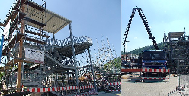 Festen Tritts auf den Steg hinauf (Fotos:Richter)(hr) Nach monatelangen Verzögerungen wurde nun der neue Treppenaufgang zum Bahnsteg am Parkplatz des Verbrauchermarktes in der Güterbahnhofstraße freigegeben. Der provisorische Treppenaufgang aus Gerüstbauteilen wurde heute abgebaut (unsere Bilder).