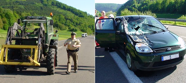 Auf abbiegenden Traktor geprallt - Beifahrerin schwer verletzt (Fotos:Richter)(hr) Beim Überholen kollidierte heute kurz nach 17 Uhr der 71-jährige Fahrer eines Ford Fiesta auf der B 37 mit einem Traktor, der nach links auf ein Wiesengrundstück abbiegen wollte. Die 62-jährige Beifahrerin des Ford aus dem thüringischen Sömmerda zog sich dabei schwere Verletzungen zu und wurde nach notärztlicher Erstversorgung ins Kreiskrankenhaus Eberbach eingeliefert.