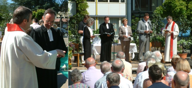 Gemeinsames Fest des Heiligen Geistes Auch Pfarrer Mathias Stößer (li.) und Ekkehard Leytz erinnerten sich am Brunnen auf dem Leopoldsplatz gegenseitig an ihre Taufe. Lektoren/innen aus den katholischen und evangelischen Gemeinden feierten gemeinsam mit den Geistlichen den Gottesdienst. (Fotos:Wörner)(tw) Zum achten Mal feierten heute die evangelischen und katholischen Gemeinden Eberbachs zusammen Pfingsten. Der evangelische Stadtpfarrer Ekkehard Leytz und sein katholischer Kollege Pfarrer Mathias Stößer gestalteten, unterstützt von Lektoren/innen aus den Gemeinden sowie dem evangelischen Posaunenchor und einigen hundert Gläubigen einen Gottesdienst. Wie in den Vorjahren, wenn der Gottesdienst im Freien stattfinden konnte, forderten die beiden Geistlichen die Gläubigen während der Messe zur Tauferneuerung auf. Dazu begab man sich in Zweiergruppen zum Brunnen auf dem Leopoldsplatz um sich mit dem Brunnenwasser gegenseitig ein Kreuzzeichen auf die Handfläche zu machen, als gemeinsame Geste für beide Konfessionen sich an ihre christliche Taufe zu erinnern.