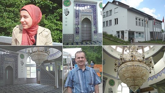 Tage der Begegnungen in der Moschee Aynur Gider im Gespräch mit dem EBERBACH-CHANNEL, die Mihrab (Gebetsnische, die die Gebetsrichtung zeigt, an der der Vorbeter seinen Platz einnimmt und die zudem eine akustische Funktion hat), die Eberbacher Moschee (oben, v.l.), Innenansichten, der Eberbacher Imam Ahmet Kurt (unten). (Fotos:Gündling)(ag) Zur Kermes, also zum Zusammentreffen verschiedener Kulturen, Menschen und Gläubigen, lädt die Eberbacher Gemeinde der Moschee am Jahnplatz bis zum Sonntag ein. Mit einem großen Buffet, zu einem Bazar, mit Gesprächen und im interkulturellen Austausch öffnet sie die Möglichkeit zur Begegnung, die bereits gestern rege von der einheimischen Bevölkerung wahrgenommen wurde und auf große Zustimmung stieß.