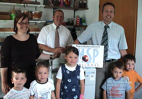 Thomas Weber, Geschäftsführer der Firma MSP mit Sitz in Walldorf, und sein Vertriebsleiter Frank Brunner übergaben das Gerät heute. Nach Gesprächen mit der Elternbeiratsvorsitzenden Heike Feuerstein sei der Bedarf für einen neuen "Kopierer" erkannt und von Weber mit der heutigen Spende umgesetzt worden. "Wir können mit diesem Gerät jetzt auch A3-Plakate kopieren", freute sich Wieder.