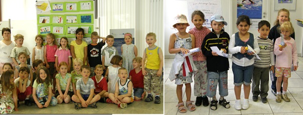 Kinderkunst Links: "Künstler" aus dem Kiga St. Maria. Rechts: "Künstler" aus dem Kiga Arche Noah. (Fotos: privat)(bro) (sch) Kunterbunt sieht es bei den beiden Volksbank Neckartal Geschäftsstellen in Eberbach und Eberbach-Nord aus. Die Vorschulkinder des katholischen Kindergartens St. Maria und die Vorschüler des evangelischen Kindergartens Arche Noah brachten ihre Hobby-Bilder zur zweiwöchigen Ausstellung in die jeweilige Geschäftsstelle. Als Dankeschön gab es Stifteköcher und Magnetschafe.