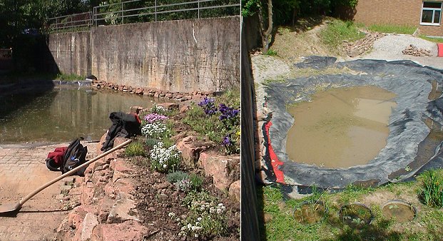 Nachdem die Schüler den Glauben an die Stadtverwaltung fast schon verloren haben, können sie nun doch noch hoffen: Wie zu erfahren war, kam aus dem Rathaus die Zusage rascher Abhilfe und Neuanpflanzung. Der Teich, dessen Folie von einer Eberbacher Firma verklebt werden wird, soll mit Unterstützung der Freiwilligen Feuerwehr Eberbach dann wieder befüllt werden. Nach dem Unwetter am vergangenen Freitag steht jetzt immerhin wieder etwas Wasser auf der löchrigen Folie (rechtes Bild).