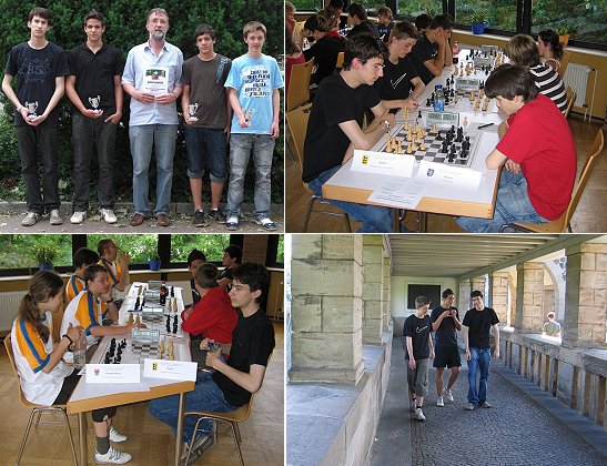 Ehrenvolles Abschneiden bei den Deutschen Meisterschaften 2008 O.l. glückliche Heimkehrer, o.r. das HSG in der sechsten Runde gegen Nidda (Hessen), u.l. die badischen Vertreter aus Eberbach vor dem Spiel gegen Cottbus (Brandenburg), u.r. die junge Schachmannschaft erkundet das Stauwehr des Edersees.