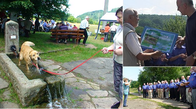 Brunnenanlage lädt Wanderer zur Rast und Erfrischung ein - NABU übernimmt Patenschaft Auch ein Hund suchte heute im Breitenstein-Brunnen eine Erfrischung. Rechts oben Günter Lipski bei der Übergabe der Patenschaftsurkunde an Arnd Koch (v.l.), darunter der MGV Liederkranz in Aktion. (Fotos:Richter)