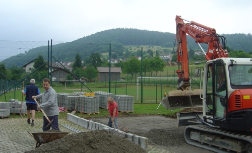 Fruchtbare Zusammenarbeit von Pleutersbacher Vereinen und der Stadt Eberbach Unser Bild zeigt die Männer vom FSV Löwen bei der Arbeit.(Foto:privat)(tw) (har) Ein lang gehegter Wunsch Pleutersbacher Vereine geht in Erfüllung. Um beim Bolzplatzparkplatz für Festivitäten ordentliche Verhältnisse zu haben, haben Stadt Eberbach, Freizeitsportverein