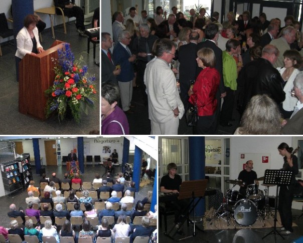 O.l. Elke Brunnemer bei ihrem Grußwort, o.r. die Zuhörer beim Umtrunk am Ende der Veranstaltung, u.l.: das Auditorium hört Schulleiter Helmut Schultz gespannt zu, u.r. das Musik-Trio der frischgebackenen Abiturienten. (Fotos:Schell)(mts) Am gestrigen Samstag lud das Hohenstaufen-Gymnasium Eberbach zum Empfang ins Rathaus ein. Das 175-jährige Schuljubiläum sollte angemessen gewürdigt werden.
