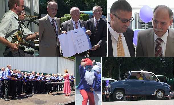 50 Jahre Erfolg mit exklusiven Möbeln Oben Mitte Geschäftsführer Dr. Andreas Wiese und Ronald Schmitt bei der Ehrung durch Bernhard Kraft von der IHK Mosbach (v.l.). Oben Rechts Minister Peter Hauk im Gespräch mit Dr. Andreas Wiese. Unten v.l. der MGV Liederkranz, die KG Kuckuck und die Oldtimershow. (Fotos:Richter)