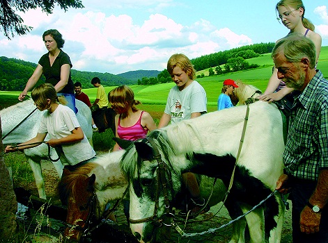 Großer Wochenendspaß für die Akkordeonkinder Ausritt mit den Ponys. (Foto: privat)(bro) (uba) Am Wochenende, 31. Mai bis 1. Juni, begann für die Akkordeonkinder des Orchesters "Picobellos" ein großer Wochenendspaß. Mit ihren Betreuerinnen Ute und Nicole Zimmermann fuhren sie mit Sack und Pack am Bahnhof in Eberbach ab. In Neckargerach angekommen, wanderten sie auf die Minneburg und hielten dort ausgiebig Rast zum Essen und Spielen. Weiter ging es nach Neckarkatzenbach. Dort bezog man Quartier im Heuhotel der Familie Braun. Ein Ausritt auf den Ponys machte allen viel Spaß, sogar die Ängstlichsten schlossen Freundschaft mit den kleinen Pferden.