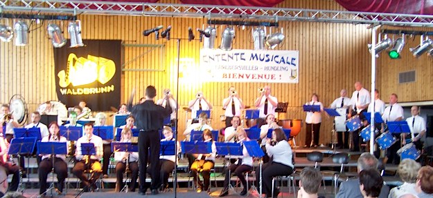 Nach der Pause folgte der Höhepunkt, das Gemeinschaftskonzert der beiden Orchester. Die große Herausforderung, nunmehr 75 Musiker zwei verschiedensprachiger Orchester auf einer Bühne zu vereinen wurde bravourös gemeistert. Die Stücke wurden an zwei gemeinsamen Probewochenenden, eines in Waldbrunn und eines in Frankreich, mit den Dirigenten erarbeitet. Sprachliche Barrikaden wurden hierbei mit Humor locker überwunden.