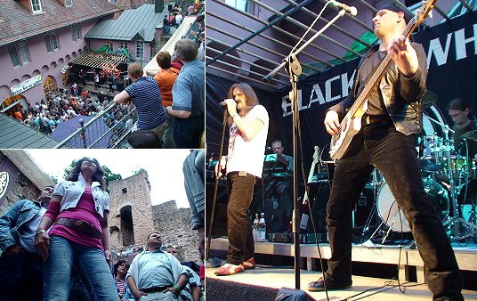 Gelb, Schwarz und Weiß dominierten den Klosterhof (Fotos:Richter)(hr) Ehrwürdige Klostermauern als Schauplatz für ein Rockevent - wer sonst, wenn nicht die Katholische Kirchenmusik Hirschhorn (KKM) könnte über einen solchen Veranstaltungsort verfügen? Der alljährliche "Rock im Klosterhof" entwickelte sich inzwischen zum Dauerbrenner und fand gestern bereits zum 16. Mal statt, wieder mit Erfolg. Das Durchschnittsalter des Publikums ist mit der Popularität des kleinen Festivals gestiegen, denn echte Fans der guten alten Rockmusik sind heute auch schon zum Teil 60 Jahre alt.
