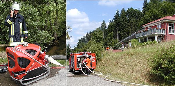 Feuerwehren aus Friedrichsdorf und Kailbach übten gemeinsam Die Pumpe der Feuerwehr Kailbach im Einsatz zur Versorgung der Löschrohre am Brandort. (Fotos:Claussen)(jc) Die Jahreshauptübung der Freiwilligen Feuerwehr, Abteilung Friedrichsdorf, war in diesem Jahr in der Ringstraße angesetzt. Dort hatten sich die Verantwortlichen einen Waldbrand ausgedacht, der bei starkem Wind durch Funkenflug auf das Dach eines benachbarten Wohnhauses übergegriffen war.