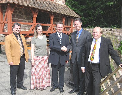 Auch Intendant Karsten Huschke (rechts auf dem Bild) sowie die beiden Geschäftsführer Heike Brock und Michael Keilbach (l.) freuten sich über die hohe Summe und über die Zusage von Kai Fischer (2.v.r.), dass er bei einer der Premieren in Zwingenberg dabei sein werde. Voraussichtlich werde auch der neue Vorstandsvorsitzende der EnBW AG, Hans-Peter Villis, eine der Aufführungen besuchen.