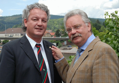 Helmut Schultz kümmert sich nun um Städtepartnerschaften Neuer Präsident Rainer Empacher (li.) und Past-President Helmut Schultz (re.). (Foto: privat)(bro) Feierlich umrahmt übernahm Rainer Empacher am Donnerstag, 3. Juli, für die Zeit bis zum 30. Juni 2009 die Amtsgeschäfte des Clubpräsidenten von seinem Vorgänger Helmut Schultz. Empacher gab in seiner Ansprache einen Überblick über seine Vorstellungen und Pläne für die kommenden Monate und benannte die Mitglieder des Vorstandes: Oliver Gärtner: Vizepräsident, Simon Jakob: Sekretär, Frank Knecht: Clubmaster, Herbert Bauer: Mitgliederbeauftragter, Werner Jakob: Schatzmeister, Thomas lhrig: Presse, Jochen Schmitt: Aktivity-Beauftragter, Roland Schilling: Wahlleiter Statuten, und Past-President Helmut Schultz kümmert sich um Jumelagen.