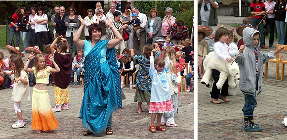 Etwas besorgt blickten die Verantwortlichen des Kindergartens schon gen Himmel, da die große Aufführung der Kinder wie immer im Freien stattfinden sollte. Hier bilden die großen Stufen vor dem Feuerwehrgerätehaus den vielen Besuchern einen guten Blick auf die Vorführungen der Kinder. Doch die Sorge war unbegründet, denn pünktlich zu der Aufführung des Stücks "Die Flaschenpost" kam die Sonne heraus und die Kinder konnten vor einem großen Publikum das singen, tanzen und spielen, was sie in den letzten Wochen mit ihren Erzieherinnen geprobt haben. Das Stück erzählt von Jens vom Großen Belt, der nicht viel Freunde hatte und eine Flaschenpost mit einem Brief und einem selbst gemalten Bild von sich um die Welt schickte. Auf der Reise um die Welt passierte die Flaschenpost viele Länder, wie z.B. Afrika, Indien, China, Mexiko und Grönland, bevor sie wieder bei Jens am Großen Belt landete. Viele Kinder schrieben einen Brief und legten selbst gemalte Bilder bei. So erkannte Jens, dass er auf der ganzen Welt Freunde hatte. Mit viel Spaß und Eifer waren die Kindergartenkinder der "Villa Regenbogen" bei der Sache und zeigten Szenen aus den Ländern, bei denen die Flaschenpost an Land gespült wurde. Riesiger Beifall belohnte die kleinen Künstler am Schluss des Stückes. Für das leibliche Wohl der Gäste sorgten anschließend die Eltern der Kindergartenkinder beim Verkauf von diversen Getränken und selbst gebackenen Kuchen.