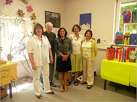 Schüler präsentieren ihre Kunstwerke Elternbeiratsvorsitzende Annette Seybold, Helmut Ehret, Schulleiterin Stefanie Srivastava, Kunstlehrerinnen Christina Wall und Ines Popelka (v.l.). (Foto: privat)(bro) (för) Am Donnerstag, 10. Juli, reihte sich die Dr. Weiß-Förderschule für einen Tag in die Aktion KunstSchauFenster des Kulturamtes der Stadt Eberbach ein.
