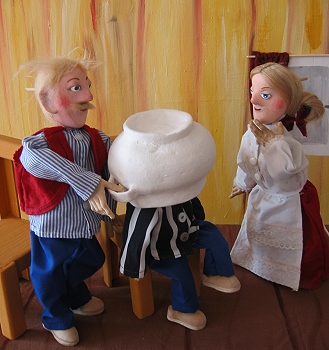 Gespielt wird mit Tischmarionetten, Schattenfiguren und Schauspiel.