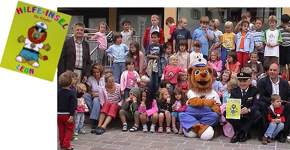 Kinderkommissar Leon sorgt für Sicherheit Magistratsmitglied Karlheinz Happes (l.), Jugendkoordinator Peter Hoffmann von der Polizeidirektion Bergstraße (r.) und Karlheinz Treusch, bei der Polizei Leiter des Hauptsachgebietes Presse- und Öffentlichkeitsarbeit (2.v.r.), mit zahlreichen Hirschhorner Kindern und "Kinderkommissar Leon". (Fotos:C.Richter)(cr) Das erste Plakat zur Aktion "Sicherer Schulweg" wurde vorgestern von dem in Hessen bekannten "Kinderkommisar Leon" am Rathaus in Hirschhorn angebracht und startete damit die "Hilfe-Inseln".