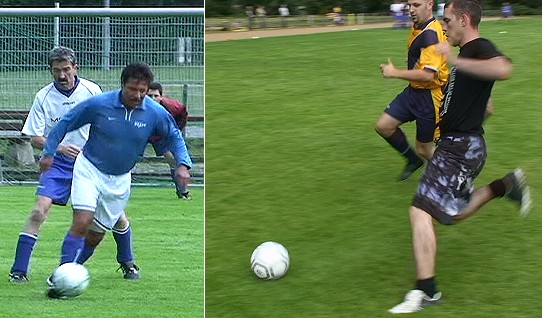 Drei Tage Neckartalcup - Royal Engineers holen Firmenpokal Links Kripo-Chef Ludwig Hillger vom Eberbacher Polizeiteam am Ball gegen die Gerd Mosca AG, rechts ein Duell aus der Anfangsbegegnung der Royal Engineers (im dunklen Trikot) gegen die Polizei Heidelberg. (Fotos:Richter)(hr) Mit dem Firmenturnier begann heute auf dem Sportplatz in der Au der diesjährige "Neckartalcup" des VfB Eberbach. Im ersten Match um 18 Uhr standen sich die derzeit in Eberbach weilenden britischen Soldaten der "Royal Engineers" und eine um Eberbacher Talente erweiterte Mannschaft der Polizei Heidelberg gegenüber (Bild rechts). Die Engländer siegten mit 1:0. Im Finale wiederholte sich diese Begegnung mit dem gleichen Endstand. Platz drei wurde durch Neunmeterschießen ausgespielt. Hier hatten die Kicker vom Polizeirevier Eberbach mit 0:2 das Nachsehen gegen die Gerd Mosca AG. Teilnehmer des "4. Eberbacher Firmencups" waren heute außerdem das Wasser- und Schifffahrtsamt sowie eine zweite Auswahl der Royal Engineers.