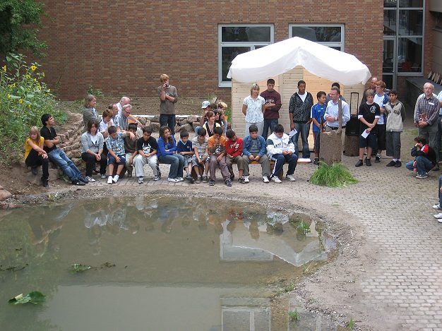 Rektorin Nicole Stämke regte in ihrer Rede zu Betrachtungen des neu erschaffenen Schulteiches mit der Schule an. Zusammengesetzt aus den Worten „Bios“ für Leben und „Topos“ für Ort ist sowohl der Schulteich als auch die Schule ein Ort an dem Leben entsteht, sich entwickelt, wächst und gedeiht.
