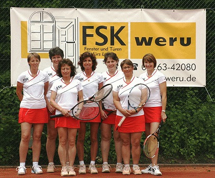 Trikotspende für die Aufsteigerinnen (Foto: privat)(bro) (jsch) Die erfolgreichen Damen 40 des TC Blau-Weiß Eberbach, Karin Appel, Beate Rothenberger, Hiltrud Schlachter, Susanne Poser, Christiane Neuer, Alexandra Wessely, Christiane Blank (v.l.), die ungeschlagen in die erste Bezirksliga aufgestiegen sind. Sie erhielten eine Trikotspende von der Firma FSK aus Zwingenberg.