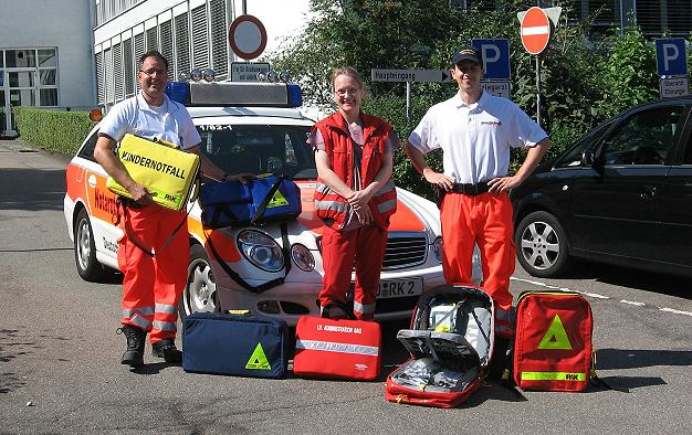 Anlass war zum einen das „neue“ gebrauchte Einsatzfahrzeug, das im Herbst gegen ein wintertauglicheres Fahrzeug ausgetauscht wird, und zum anderen das neue Notfall-Rucksacksystem. Dieses System wird nun anstelle der sperrigen medizinischen Metallkoffer in den Fahrzeugen vorzufinden sein. Die neuen Rücksäcke sind nicht nur handlicher sondern auch mit allen medizinischen Notfallgeräten – insbesondere auch für Notfälle bei Kindern – ausgerüstet.