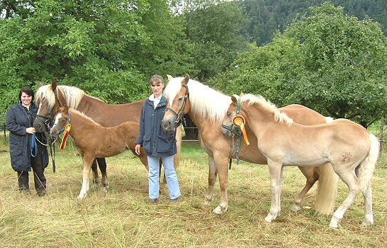 Gold-Plakette für die Fohlen Fenja und Sandro Stefanie Haag mit Farah-Victoria und Fohlen Fenja, Fohlen Sandro mit Natascha und Heike Helm (v.l.). (Foto: Barbara Nolten-Casado)(bro) (bnc) Schön sind sie anzuschauen, die zwei Gold-Fohlen, wie sie mit ihren Müttern über die Neckar-Wimmersbacher Koppel traben. Ganze zwei Monate alt ist die kleine Fenja, Tochter von Schwarzwälder-Fuchs-Dame Farah-Victoria. Das Haflinger Hengstfohlen Sandro hat bereits Ende März das Eberbacher Licht der Welt erblickt und wird nun von Mama Natascha liebevoll umsorgt.