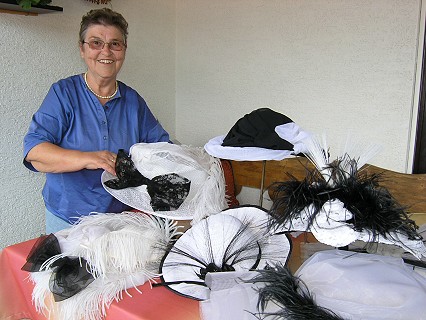 Maria Riedl, die Putzmacherin der Zwingenberger Schlossfestpiele Maria Riedl und ihre edlen Hutkreationen. (Foto:Nolten-Casado)(ag) (bnc) Wohl behütet werden Solistinnen und Chordamen der Zwingenberger Schlossfestspiele in „My fair Lady“ zum Ascot-Derby schreiten. Dafür sorgt Maria Riedl, gelernte Modistin - zu deutsch „Putzmacherin“ -, und Urgestein der Festspiele. Seit gut einem Vierteljahrhundert singt die waschechte Eberbacherin im Festspielchor, hilft bei der Aufarbeitung der Kostüme mit und hat sich als Fachfrau für Kopfbedeckungen unentbehrlich gemacht.