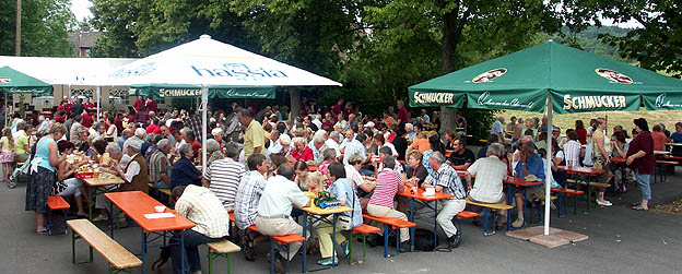 Nur schönes Wetter zu Beginn des Festes Guter Besuch herrschte beim traditionellen Musikfest der Feuerwehrkapelle Waldkatzenbach. (Foto: Baumgartner)(tb) Am heutigen Sonntag feierte die über die Waldbrunner Gemeindegrenzen bekannte Feuerwehrkapelle Waldkatzenbach ihr fast schon traditionelles Musikfest unter den Linden im Hof des Bürgersaals von Waldkatzenbach. Dieser Sonntag stand ganz im Zeichen der Blasmusik. Morgens begann man nach den Gottesdiensten mit einem zünftigen Frühschoppen, der von der Musikkapelle Kleiner Odenwald Allemühl umrahmt wurde. Für das leibliche Wohl war dann beim gemeinsamen Mittagessen bestens gesorgt. Bei Kaffee und Kuchen spielte in den Mittagsstunden der Musikverein Mosbach auf. In den frühen Abendstunden sorgte dann die Feuerwehr- und Stadtkapelle Adelsheim für die Unterhaltung der zahlreichen Besucher. Nachdem die Musikkapelle Neunkirchen die Besucher in den frühen Abendstunden unterhielt, setzte die SF-Band Schwarzach den zumindest musikalischen Schlusspunkt des diesjährigen Musikfestes der Feuerwehrkapelle Waldkatzenbach. Nicht ganz so viel Glück hatte man in diesem Jahr mit dem Wetter. Nach dem Sonnenschein und schwüler Witterung zum Start des Frühschoppens zogen am Nachmittag Gewitterwolken auf. Im Rahmen des diesjährigen Musikfestes wurden auch Nachwuchsmusiker der Feuerwehrkapelle vom Blasmusikverband Odenwald-Bauland geehrt.