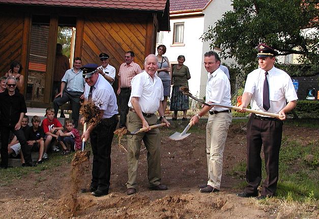 (jc) Die Lindacher Abteilung der Eberbacher Feuerwehr bekommt an der B37 erstmals eine eigene Unterkunft. Vorgestern wurde mit den ersten Spatensichen die Bauphase offiziell eingeläutet. Während zunächst nur etwas Erde für die Kameras der hiesigen Presseorgane sowie einige Schaulustige "verwirbelt" wurde und im Anschluss sogar noch gekühlter Sekt "geschlürft" werden durfte, sind ab September dann Kraft und Fleiß, auch seitens der Feuerwehr selbst, gefordert, denn zu den rund 385.000 Euro berechneter Kosten für das Domizil kommt ein großer Brocken an Eigenleistung, den die Kameraden ehrenamtlich selbst erbringen wollen.