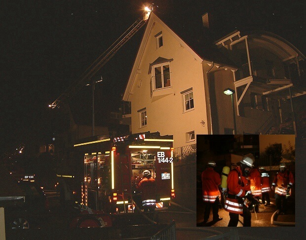 Kurz nach 23 Uhr wurde die Eberbacher Feuerwehr zu einem Brandeinsatz in die Mühlbergstraße nach Rockenau gerufen. Als die Helfer bei heftigem Regen wenig später mit fünf Einsatzfahrzeugen am Brandherd eintrafen, konnten sie das Feuer schnell unter Kontrolle bringen und löschen. Bei anschließenden Sicherungsmaßnahmen mit der Drehleiter wurden eventuelle Schwelbrände in der Dachisolierung ausgeschlossen.