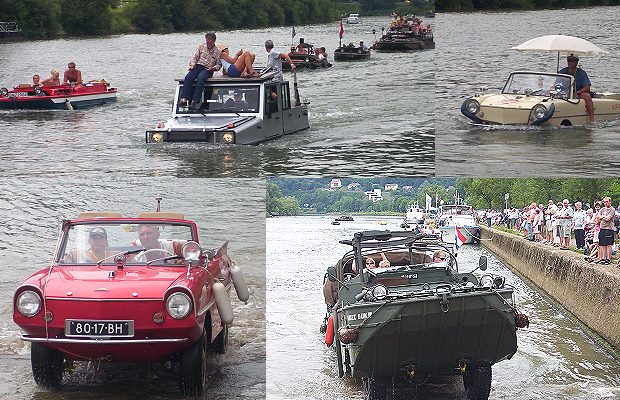 Eine bunte Schwimmwagenflotte ging in Eberbach an Land (Fotos: F. Broghammer)(bro) Zu bestaunen waren gestern in Eberbach rund 50 Amphibienfahrzeuge, die am Neckarlauer an Land fuhren. Gestartet waren die "Les Amis de L'Amphibie", die sich seit 20 Jahren jedes Jahr für eine Woche in einem anderen europäischen Land treffen, in Hirschhorn.