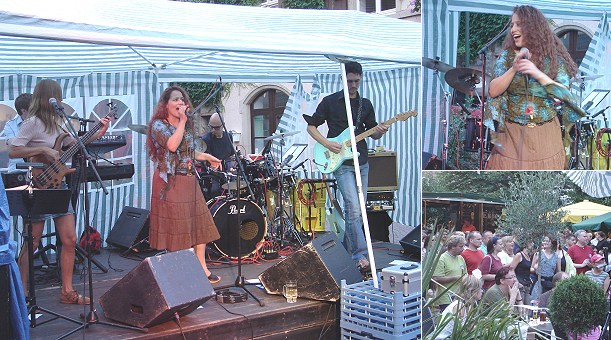 Sommerabend mit mitreißender Musik (Fotos:Gündling)(ag) Das Auf und Ab des Lebens, seine Höhen und Tiefen bekommen eine andere Dimension, wenn Renée Walker sie besingt und mit ihrer warmen Ausstrahlung vor dem Publikum steht. Wenn sie ihre Riesenstimme über den Sound von Post Grunge, Pop und Alternative Rock legt, ihr Publikum mitreißt und für einige Zeit vom Alltag ablöst, so wie am Samstagabend auf dem Lindenplatz, wo sie auf dem Eberbacher Open Air wieder zahlreiche Besucher und Fans anlockte, die immer mehr mitgingen und mittanzten und Zugaben einforderten.