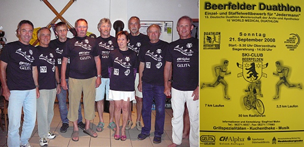 Plakat und T-Shirt für den Duathlon 2008 vorgestellt Links: Das neue T-Shirt wird Probe getragen von Herbert Siefert (Leichtathletikwart), Herbert Menges (Duathlon-Helfer), Dieter Hövelmann (2.Vorsitzender), Heinrich Braner (Kassenwart), Werner Fahrbach (Sponsoring-Organisator), Traudl Massing (Schriftführerin), Fred Leinweber (Pressewart), Hans Speier (Leichtathlet) und Jürgen Wolf (DSV Personaldirektor) (v.l.). Rechts: das entworfene Plakat. (Fotos: privat)(bro) (fl) Freudige Gesichter gab es am 29. Juli beim Skiclub Beerfelden. Anlass dafür war die Vorstellung der frisch eingetroffenen T-Shirts und der Plakate für den diesjährigen Duathlon, der für den SCB wieder das sportliche Hauptereignis des Jahres darstellen wird und bei dem wieder ein hochrangiges Teilnehmerfeld erwartet wird.