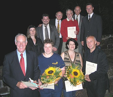 Alle Geehrten haben eines gemeinsam: sie alle haben vor über 25 Jahren begonnen, sich für Zwingenberg zu engagieren. In einer Zeit also, in der die Schlossfestspiele noch nicht viel mehr waren als eine Idee, ein Versuch, im wunderschönen Ambiente des Schlosshofes Kultur zu etablieren. Ihren aktiven Beitrag dazu brachten und bringen Karin Heiler, Ulrike Boschert und Hans Sachsenheimer, die seit 25 Jahren den Festspielchor verstärken, genau wie Mirek Jahoda, der über die gleiche lange Zeit seinen festen Platz im Festspielorchester inne hat. Prinz Ludwig von Baden nimmt neben seiner „natürlichen“ Funktion als Hausherr und Gastgeber auf dem Schloss von Anfang an sehr gewissenhaft auch die Aufgaben eines Beisitzers im Vorstand wahr. Dafür wurde er ebenso geehrt wie Peter Kirchesch, der seit 25 Jahren das Amt des stellvertretenden Vorsitzenden wahrnimmt und aus dem Festspielgeschehen nicht weg zu denken ist.