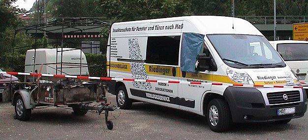 Die Freiwillige Feuerwehr Eberbach wurde alarmiert und erreichte rasch den nur wenige Meter vom Gerätehaus entfernten Brandherd. Unter Einsatz von Atemschutzgeräten konnte das Feuer auf dem mit Material beladenen Anhänger schnell gelöscht und ein Übergeifen der Flammen auf einen daneben geparkten Fiat Ducato verhindert werden. Der Transporter wurde aber dennoch erheblich beschädigt.