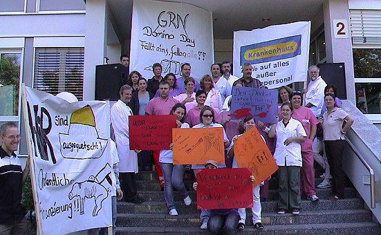Vor dem Haupteingang trafen sich die Angestellten und Auszubildenden zu einer öffentlichen Mitarbeiterversammlung. Mit Transparenten forderten sie: "Genug gespart - der Deckel muss weg" und zeigten damit ihren Unmut über die Sparpolitik der Bundesregierung. Ralf Geiger, stellvertretender Betriebsleiter, konnte mit teilweise erschreckenden Fakten aufwarten: Seit 15 Jahren habe man die Kostendämpfungspolitik ertragen. Für 2008 sehe die Situation so aus, dass mehr als die Hälfte aller Krankenhäuser mit einem erheblichen Defizit abschließen werden. Die Folge sei ein weiterer Personalabbau, der sich auf die Versorgung der Patienten auswirken werde. Ebenso drohe die Stillegung einzelner Fachabteilungen oder ganzer Krankenhäuser.